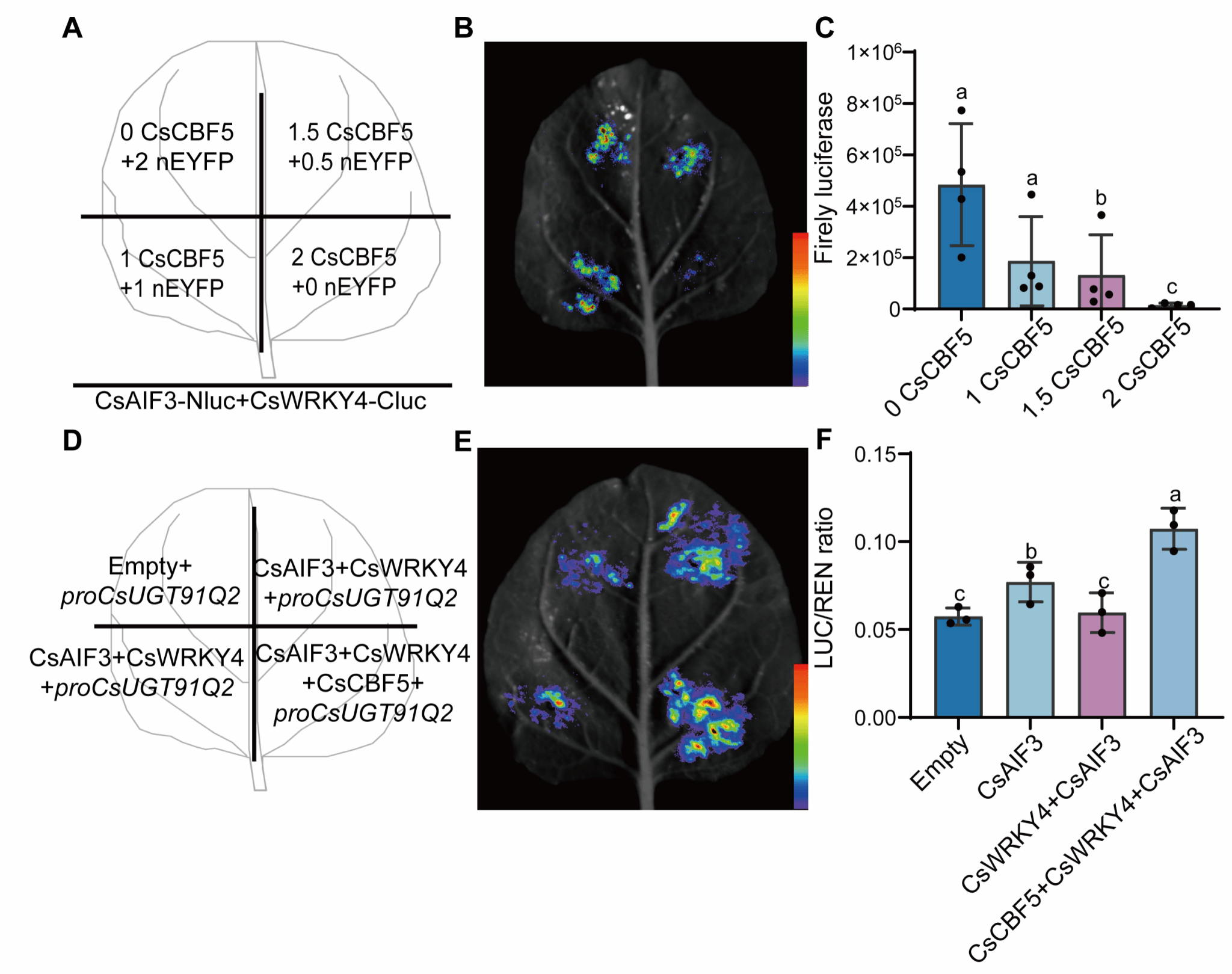 除“油门模块”外,团队还发现茶树体内存在“刹车元件”——转录因子CsWRKY4。常温条件下,CsWRKY4与CsAIF3发生蛋白互作,抑制其对CsUGT91Q2的转录激活,维持橙花叔醇糖苷的基础合成水平,避免抗寒代谢物在非胁迫条件下过度积累,实现抗寒响应的精细调控。