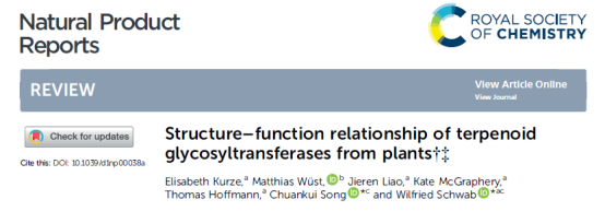 近期,天然产物领域国际顶级期Natural Product Reports ( 《天然产物报告》 ,影响因子IF = 13.4236)在线发表了我室宋传奎教授为共同通讯作者的长篇综述 “Structure-function relationship of terpenoid glycosyltransferases from plants”(DOI: 10.1039/D1NP00038A)。该工作由我室宋传奎教授联合我校讲席教授、慕尼黑工业大学Wilfried Schwab教授合作完成。