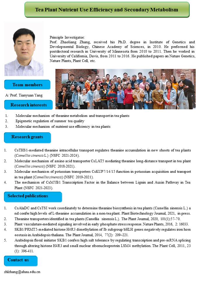 Tea Plant Nutrient Use Efficiency and Secondary Metabolism (PI: Zhaoliang Zhang)
