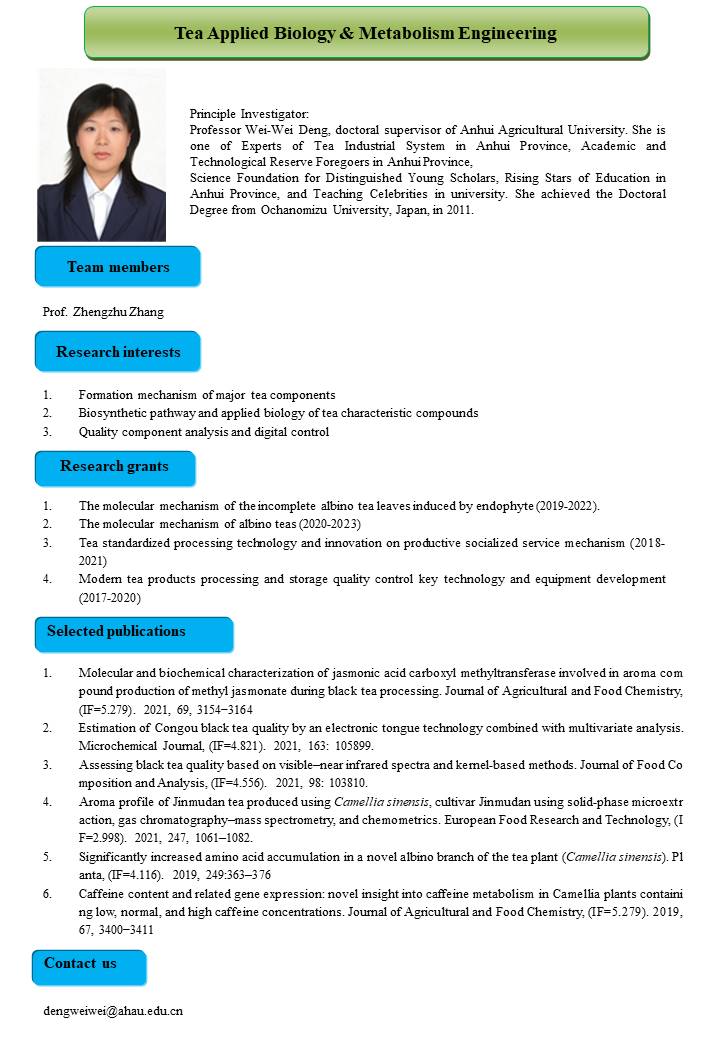 Tea Applied Biology & Metabolism Engineering (PI: Weiwei Deng)